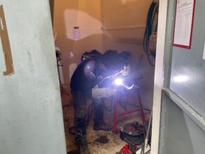 Les travaux se poursuivent avec à la manœuvre pour ce deuxième jour, William, Enzo, Emmanuel et David, ouvriers de l’entreprise Croze. Tous sont occupés pour confectionner les pièces hydrauliques sur mesures et raccorder tous les dispositifs nécessaires à la bonne marche des nouvelles chaudières gaz à condensation : réseau gaz, évacuation des fumées, condensats, armoire électrique, …