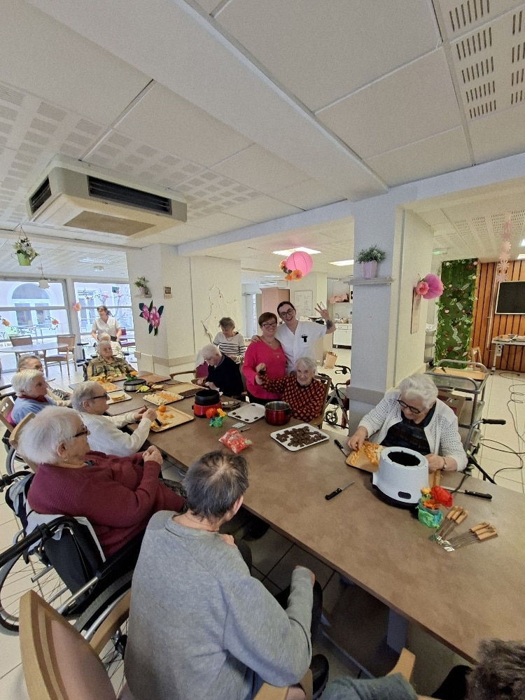 Au cœur de cet après-midi gourmand : une délicieuse fondue au chocolat qui a enchanté les papilles de chacun. Dans une ambiance chaleureuse et détendue, les résidents se sont retrouvés autour de fruits frais, de guimauves moelleuses et de morceaux de brioche, à savourer délicatement enrobés d’un chocolat fondant et généreux.